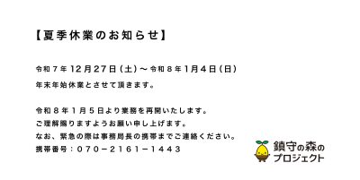 冬季休業のお知らせ2025 2025.12.26 公益財団法人 鎮守(ちんじゅ)の森のプロジェクト 〒105-0001 東京都港区虎ノ門3-7-2 虎ノ門372ビル 2階 TEL 03-6432-0085 / FAX 03-6432-0086 ← Previous Next →